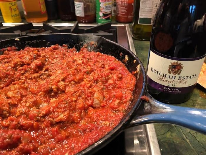 This is a very easy sauce that has evolved over time. Allie makes it weekly for her family and it gets devoured. Allie loves that she can whip it up in less time than it takes to boil the pasta and it can be make with food she typically already has in her kitchen. Allie cheats a little in that she adds a jar of pre-made high quality marinara sauce to the meat. Allie serves the sauce over pasta (the current favorite in her house is Farfalli) with a simple tossed salad and a loaf of frozen garlic bread (like Pepperidge Farm).